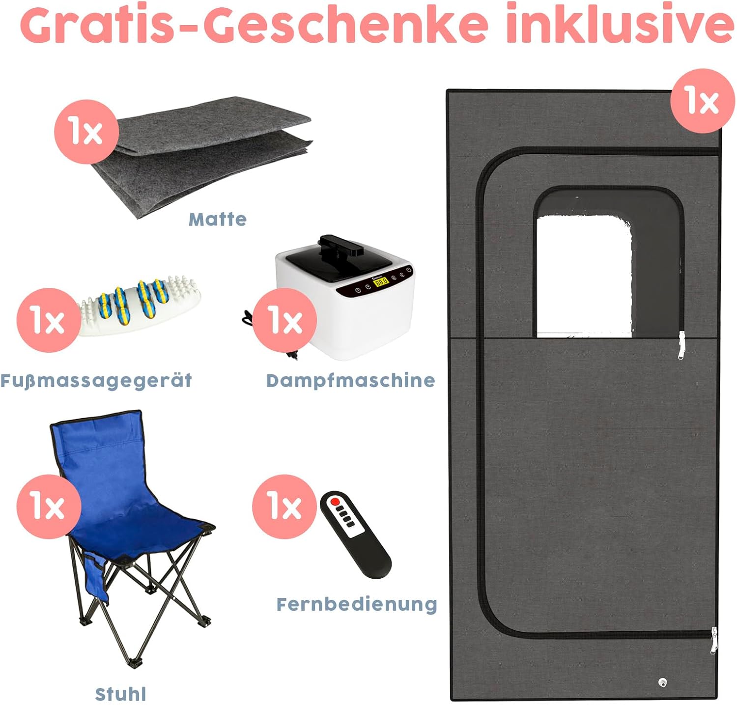 PŘÍSLUŠENSTVÍ ZDARMA V CENĚ: Naše skládací sauna je vybavena vším, co potřebujete pro relaxaci a regeneraci. Součástí je pohodlné křeslo, praktické dálkové ovládání, uklidňující masážní přístroj na nohy a protiskluzová podložka pro větší bezpečnost a pohodlí.